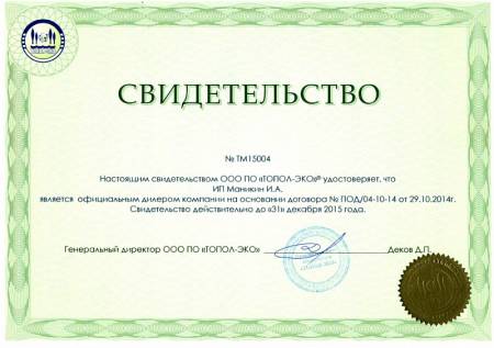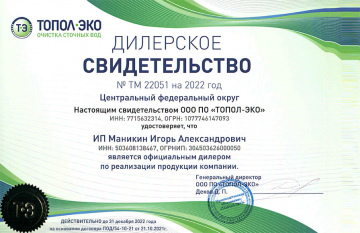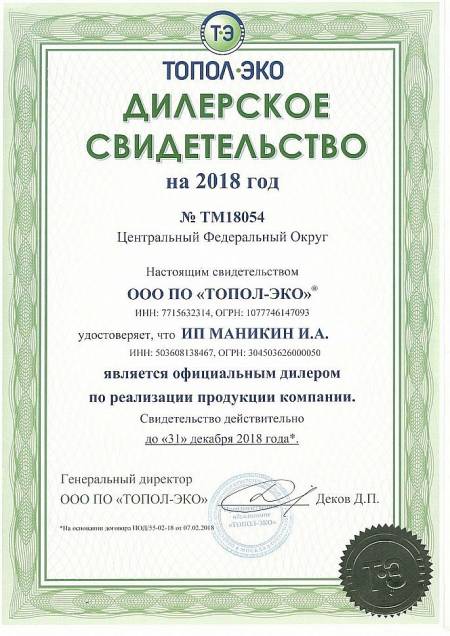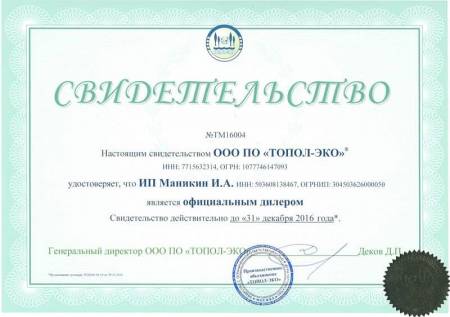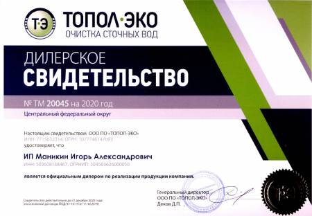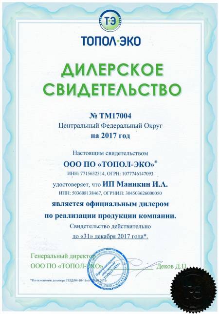 ИП Маникин И.А. (сайты ekotopas.ru/topas-krasnodar.ru и их поддомены) является официальным представителем ГК «ТОПОЛ-ЭКО» (проверить дилера) - первого и крупнейшего в России производителя автономных канализаций, работающих по аэрационному принципу.